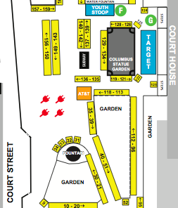 We have a prime spot right in between the garden and the Target Children’s Area (see the table 123 right near the stairs of the Courthouse, at the foot of the box labeled “Target”).